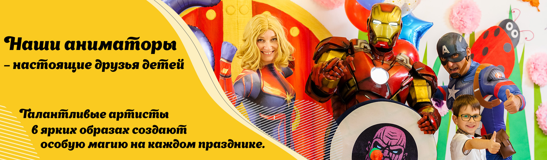 У нас найдется все необходимое, чтобы сделать ваше мероприятие по — настоящему интересным, веселым и незабываемым. Лучшие аниматоры и клоуны Минска, самые яркие костюмы, авторские, оригинальные игры.